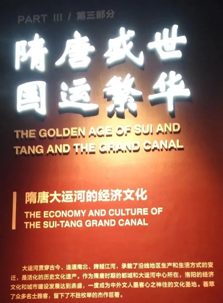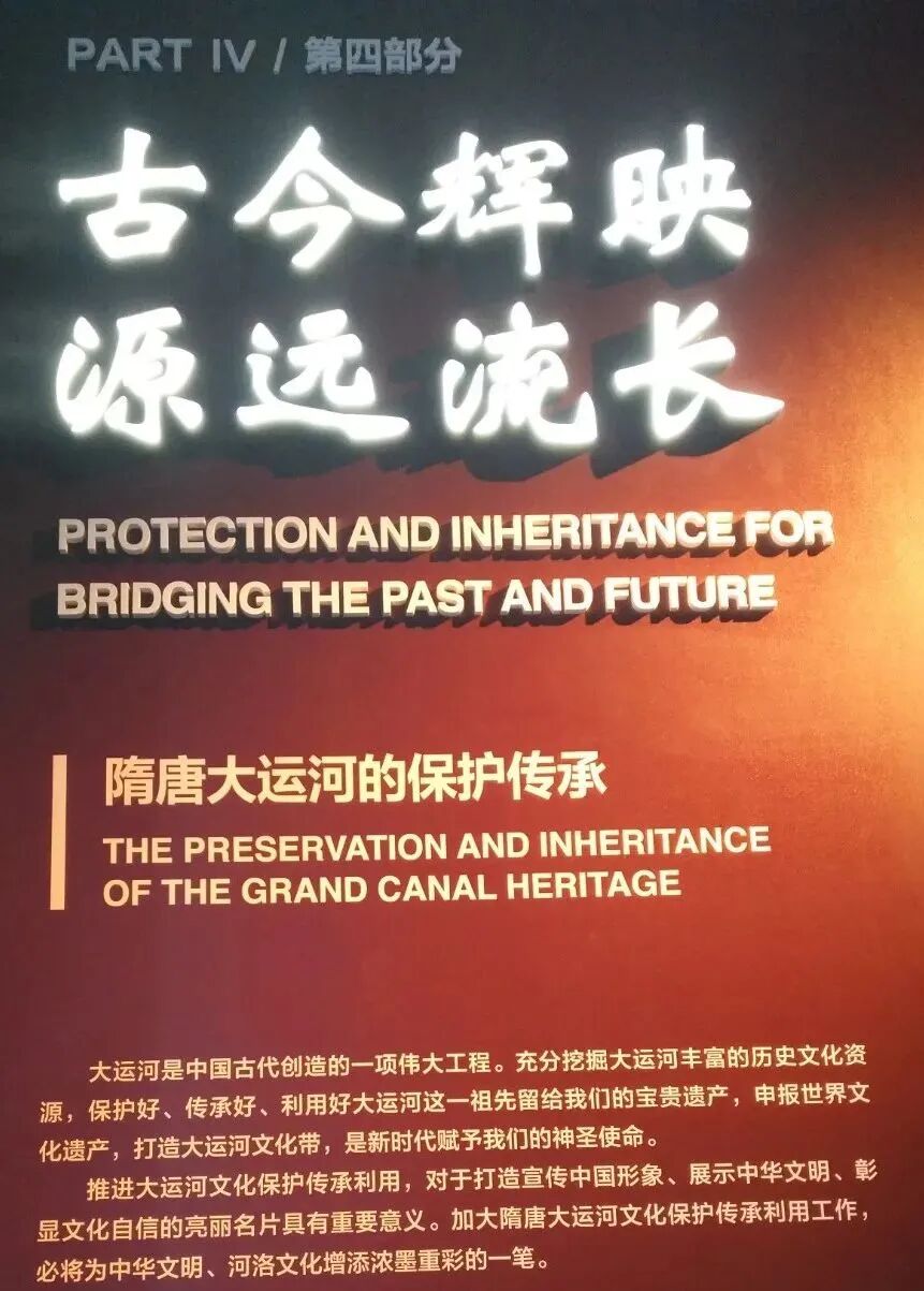 最后我们来参观博物馆的第四部分,古今辉映,源远流长,隋唐大运河的保护传承。2014年在卡塔尔首都多哈召开的第38届世界遗产大会上宣布:中国大运河项目成功入选世界文化遗产名录,成为中国第46个世界遗产项目。大运河穿越北京、天津、河北、河南、山东、江苏、浙江、安徽等省市,是世界上最长的人工河道。在洛阳有两个遗产点,回洛仓和含嘉仓,也对外开放,大家有时间也可以去参观游览下。