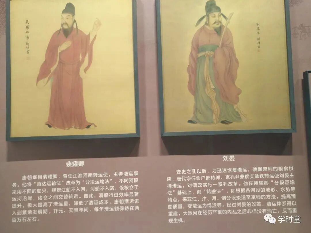 而在管理中也出现了很多优秀的官员,比如展板上我们看到的裴耀卿,由于河段的深浅不同,船只也制造的不同,如果是一次运输直达,会有很多的阻碍。所以他就改革直达为分段运输,规定江船不入河,河船不入洛,并且在运河沿岸设置粮仓,粮仓之间交替转运,这样大大提高了漕运量,降低了成本。到了北宋时期,大运河的年运量从唐代的100万石提高到了735万石,这对北宋开封的繁荣起到了关键性的作用。