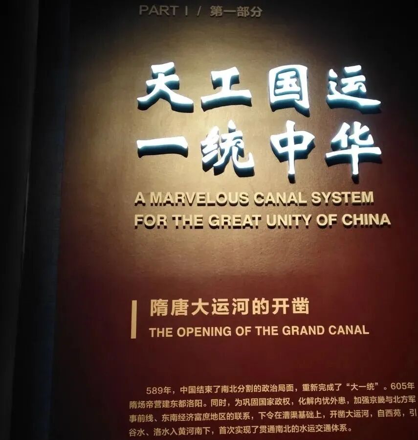 文化展的第一部分是天工国运,一统中华,隋唐大运河的开凿。在进入第一部分之前,我们一起来思考一个问题,就是隋炀帝为什么要开凿大运河?其实总结起来就是一发展经济,要想富先修路呀,大运河就是古代重要的交通方式。二政治需要,大运河就像一个张开的双臂一样,将整个国家拥在怀中,并且有了漕运的强大物质基础,可以为四方征讨的战争提供保障。