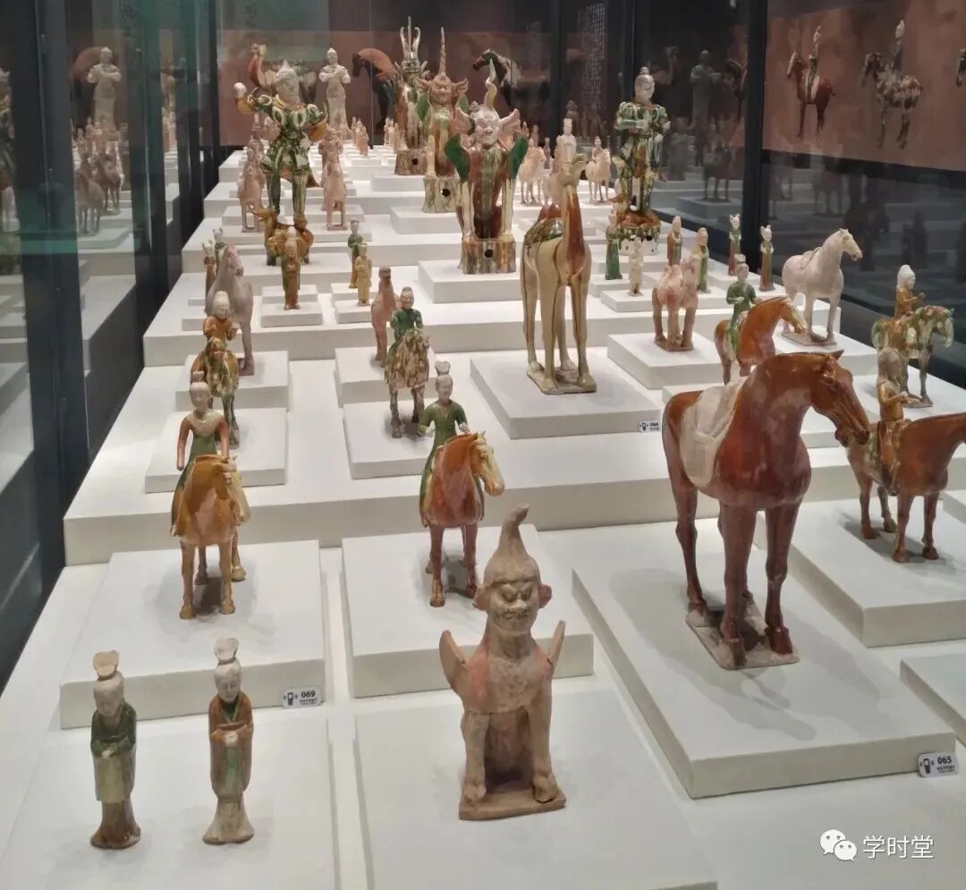 现在我们看到的就是博物馆内最大的展柜,展出的是一组三彩矩阵,作为一种低温釉陶,洛阳是唐三彩的首次发现地,这些三彩作品造型生动,活灵活现。不过大家有没有发现,所有的人物面部都是没有釉彩的,其实原因也很简单,由于釉彩在高温下有流淌的现象,所以脸上的色彩都是在三彩烧制好以后再画上去了。等我们将这些文物出土以后,脸上的色彩已经氧化掉了。