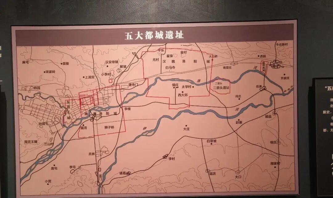 二 洛阳为都城所在,公元605年,隋炀帝命将作大监宇文恺营建洛阳城,这成为隋唐时期的都城所在。这个展板展示的就是洛阳的五大都城,洛阳是当时的政治经济中心。