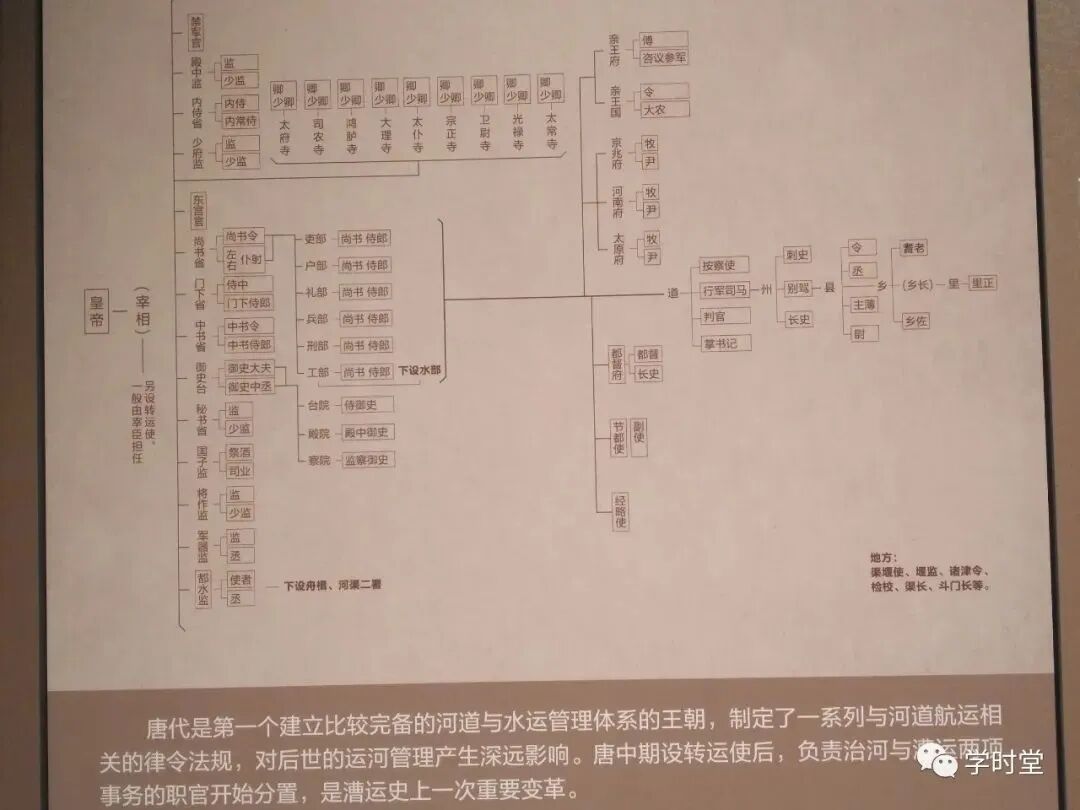 大运河的运转离不开人的管理,说到管理就要说到隋唐开始的三省六部制,我们来看展板,三省指的是门下省、中书省、尚书省。尚书省下设吏部、户部、礼部、民部、刑部、工部。这就是三省六部制度了。而在工部的下面设水部,负责河流的治理。而都水监是负责漕运的管理,这样分开管理效率更高,更利于大运河的良好运转。