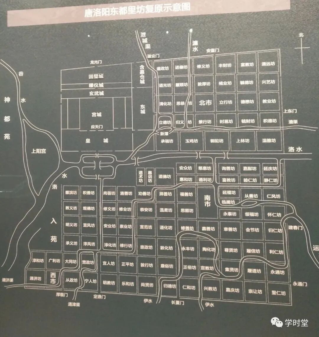 我们来看这个隋唐洛阳城的示意图,我们能看到图上的新潭码头,也能看到上方的泄城渠,泄城渠的作用就是将运来的粮食运到含嘉仓储存,一会我们会专门再讲这个含嘉仓。