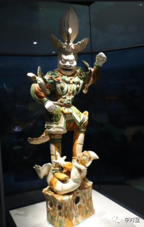 我们现在看到的这个是三彩的天王俑,我们看他脚踩夜叉,怒目圆睁,身着明光铠,典型的唐代武将形象,是大运河博物馆文物当中较为珍贵的一个三彩作品了。