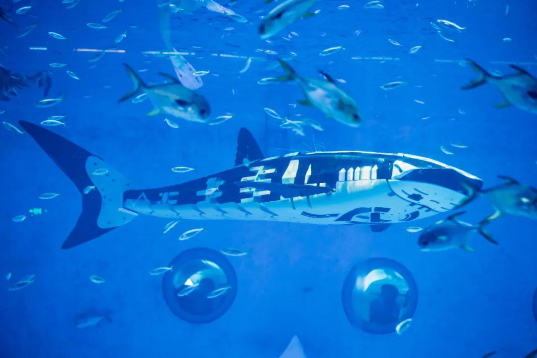 拥有中原最大展面的无边际海底视窗,还展示有世界首款机甲鲸鲨和机甲鳐鱼。