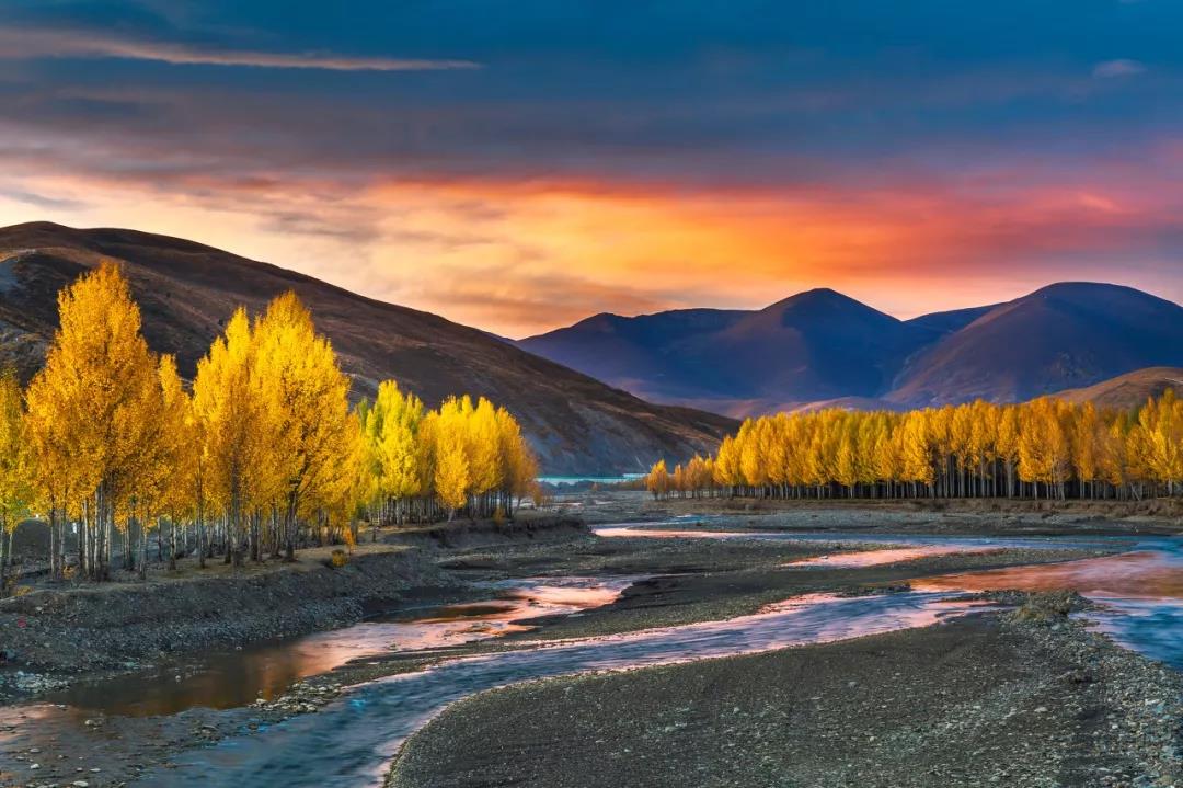 夕阳的映照下、挺拔高大的杨树、摇曳着闪闪发亮的叶片、连绵的山峦、金碧辉煌的寺庙、纯净闪耀的夜空......